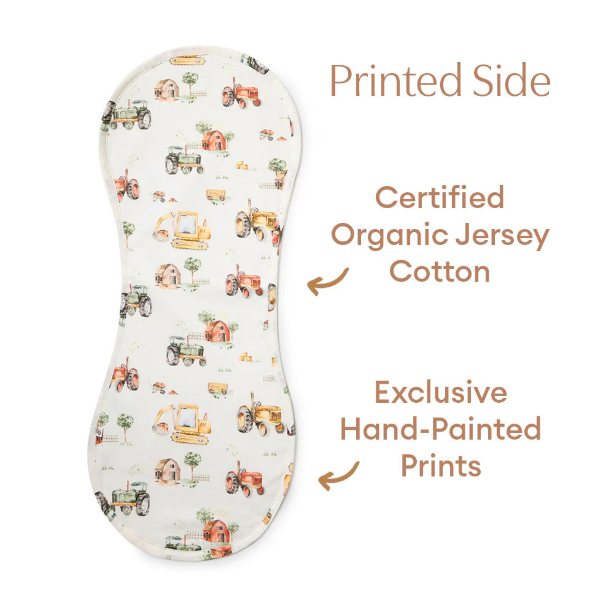 Crafted from GOTS certified organic cotton, this burp cloth features a dual layer design built to perform while staying gentle. The upper layer showcases the playful, exclusive Diggers & Tractors print in Snuggle Hunny’s signature SnuggleSoft™ jersey cotton, while the reverse side is made from premium organic terry towelling to absorb spills quickly and effectively.