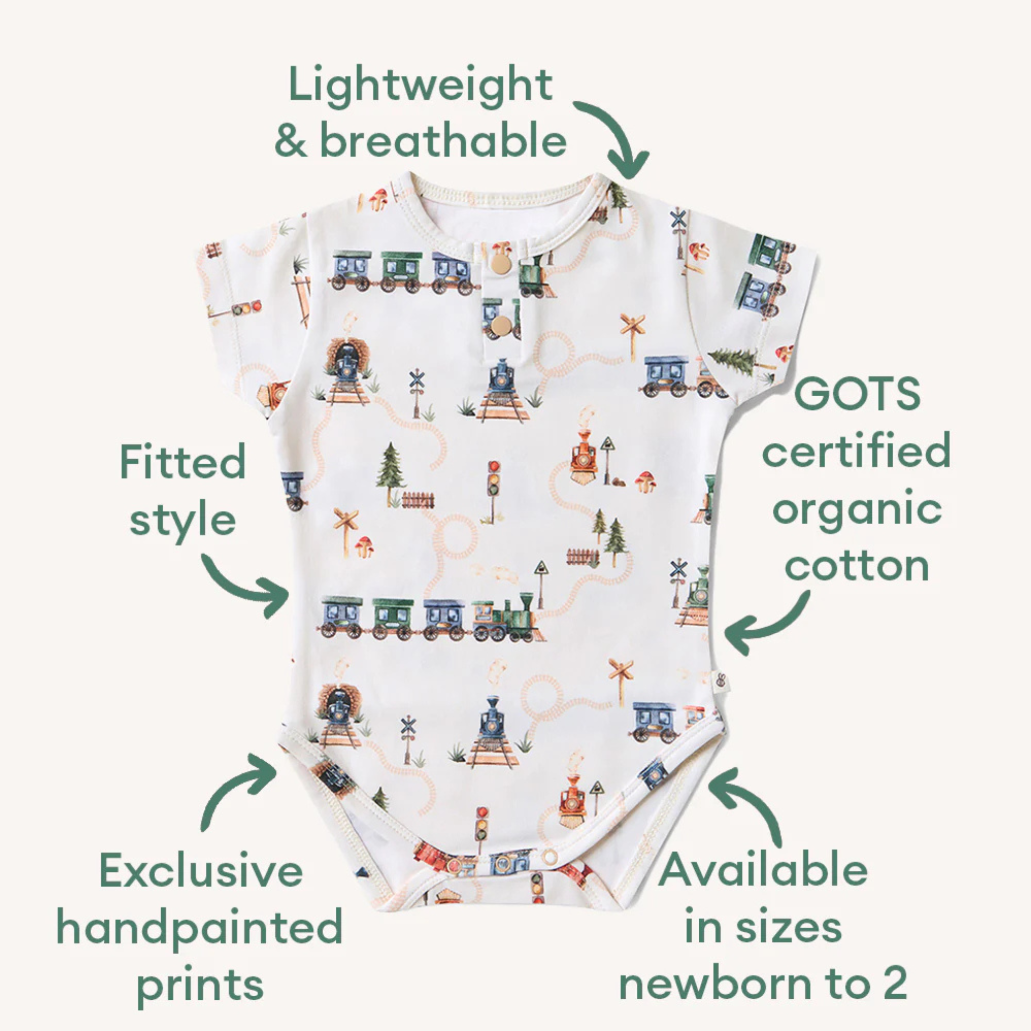 Crafted from GOTS Certified Organic Cotton (CU 1182228), it’s soft, stretchy, and gentle on delicate skin. The exclusive Trains print adds a sweet touch of charm, while the lightweight fabric and fitted style make it an easy choice for both newborns and active toddlers.