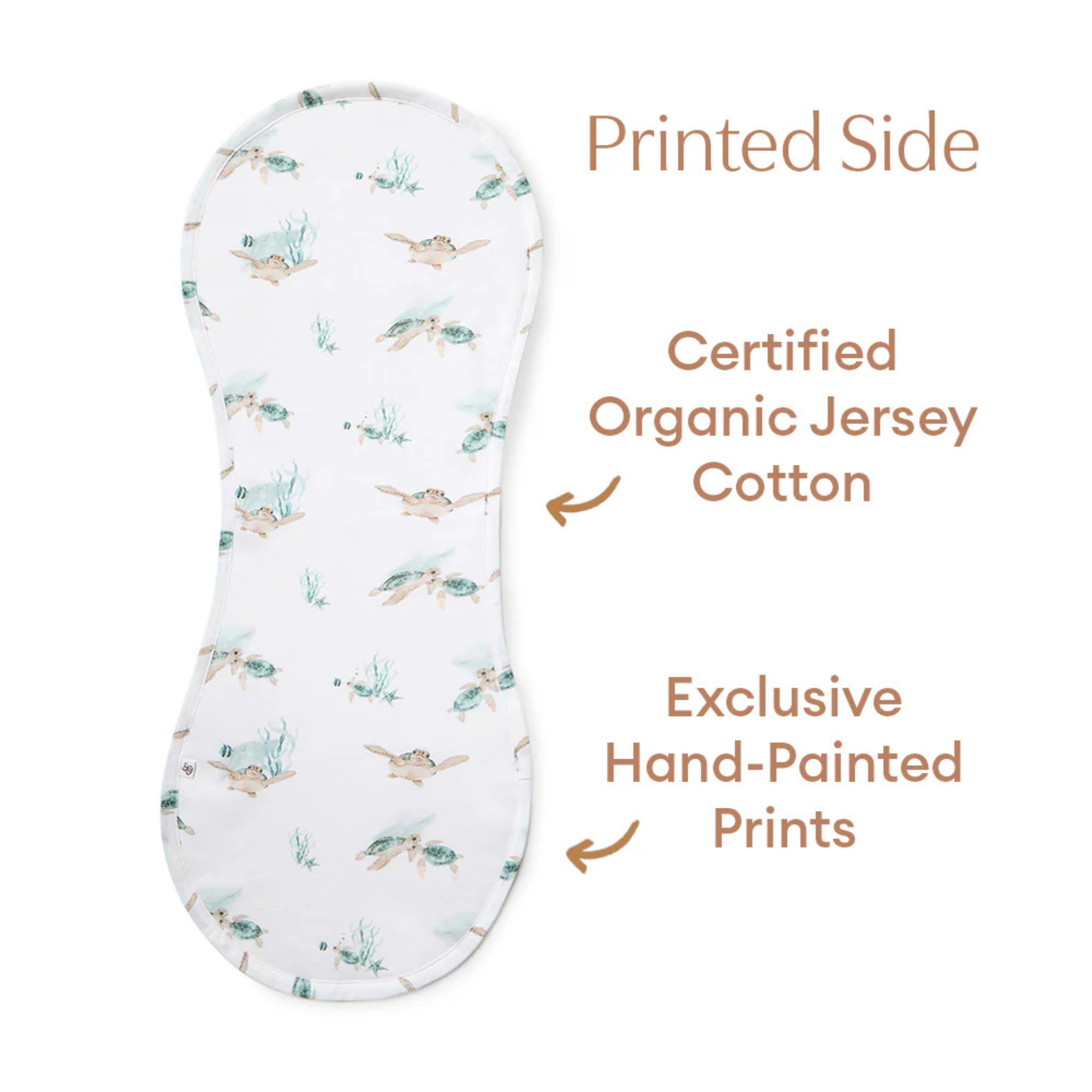 Crafted from GOTS certified organic cotton, this burp cloth features a soft, printed Turtle jersey cotton upper and a premium organic terry towelling underside to absorb feeds quickly and effectively. Its generous size drapes naturally over the shoulder, staying in place during burping, feeding or winding, helping protect clothing without constant adjustment.